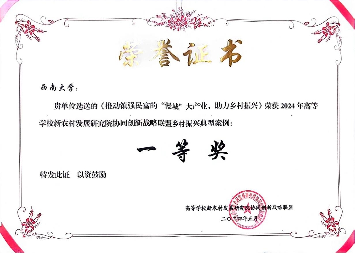 此次会议,评选出一等奖案例、二等奖案例和“十佳案例”,这些案例涵盖了科技特派员制度、特色产业发展、中药材产业振兴等多个方面,展现了涉农高校在乡村振兴中的积极作用。其中,我院选送的肖亚成教授的《推动镇富民强的“慢城”大产业,助力乡村振兴》案例荣获2024年高等学校新农村发展研究院协同创新战略联盟乡村振兴典型案例一等奖。近年来,我院聚焦国家乡村振兴战略和重庆市实施乡村振兴行动计划,打造高校服务乡村振兴战略“西大模式”,形成西部特色乡村振兴方案。这些方案的实施有助于促进农村产业融合发展、提升农民素质和能力、改善农村人居环境等方面的工作,为乡村振兴提供了有力支撑。